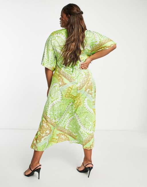 ASOS DESIGN Curve paneled satin midi dress with keyhole in green scarf print Very well made.