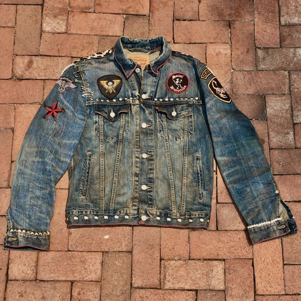 SOLD LEVIS AGED BIKER LEOPARD PUNK ROCK STUDDED PATCHED PEARLED DENIM JACKET MEDIUM Very well made.